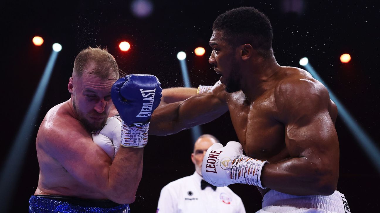 Anthony Joshua busted up Otto Wallin's nose and eyes in a strong performance that forced Wallin's corner to stop the bout before the start of Round 6 on Saturday.