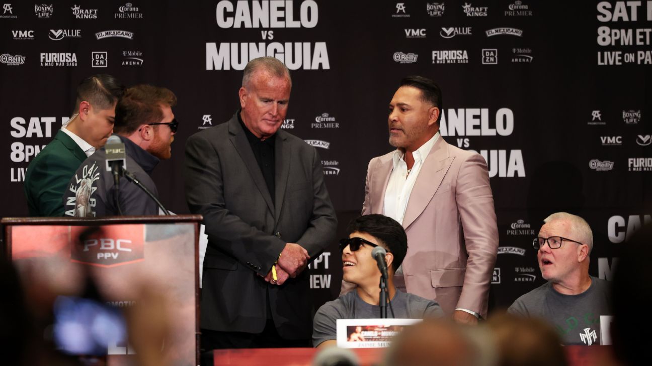Canelo Alvarez and his former promoter, Oscar De La Hoya, engaged in a heated verbal exchange at a Wednesday news conference ahead of Alvarez's undisputed super middleweight championship defense vs. Jaime Munguia on Saturday.