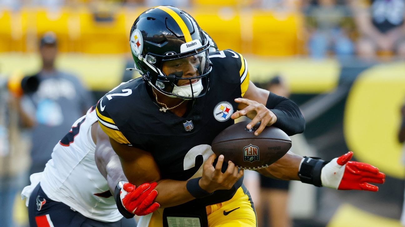 Justin Field went 5-of-6 for 67 yards in three series in his Steelers debut, but he was part of two fumbles and was sacked twice in a sloppy 20-12 loss to the Texans.